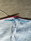 1. Klipp till två stycken à 42x42 cm av denimtyget. Lägg en del med rätan uppåt, nåla fast ditt stickade stycke ovanpå med avigan uppåt och nåla till sist fast den andra denimstycket överst med avigan uppåt. Sy ihop runt om med 1 cm sömsmån, men lämna öppet för vändning.