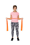 Stå med rak rygg och håll i gummibandet med händerna nära varandra, ha tummarna uppåt. Armbågarna ska vara böjda och hållas intill kroppens sidor genom hela rörelsen. Vrid ut underarmarna så långt du kan utan att armbågen släpper kontakten med din kropp. Återgå därefter långsamt till utgångspositionen. Upprepa 10 ggr. Håll hela tiden axlarna nere, undvik att dra dem mot öronen. Jättebra övning för skulderbladen!