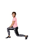 Stå höftbrett isär med fötterna. Ta därefter ett stort steg framåt med höger fot, böj båda knäna och se till att ryggen är rak. Gå inte för långt fram med tyngden så att knät kommer över främre foten. Skjut därefter ifrån med främre foten, återgå till utgångspositionen och skifta sedan ben så att du tar ett kliv framåt med vänster fot. Upprepa 6 ggr/ben. I den här övningen tränar du både hållningen och benen samtidigt, då du måste hålla kroppen upprätt när du tar steget framåt.