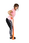 Stå på gummibandet med båda fötterna. Fäll dig lätt framåt i höften med rak rygg och lätt böjda knän. Håll långt in på gummibandet. Dra därefter armbågarna mot taket, och bibehåll kroppen lätt fälld hela tiden. Återgå sedan till utgångspositionen. Upprepa 10 ggr. Detta är en bra övning för ländrygg och skulderbladen.