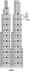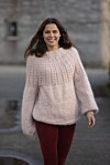 Garn & -åtgång: 9 (9) 10 (10) 11 (11) nystan fg nr 302 (naturvit) av Kid Silk (77% Kid Mohair, 23% silke), 25 g/ca 200 m. Samt 5 (5) 6 (6) 6 (6) nystan fg nr 762 (puder-rosa) av Alpaca Liten Storm (40% Alpaca Superfine, 40% Merino Ull, 20 % nylonfiber), 50 g/ca 175 m. Garn,Viking Garn, www.viking-garn.no.