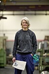 Däremot är hon trött i ryggen och benen efter att ha stått vid en planslipnings- maskin hela dagen, och det känns i armarna att hon lyft åtskilliga metallstycken.